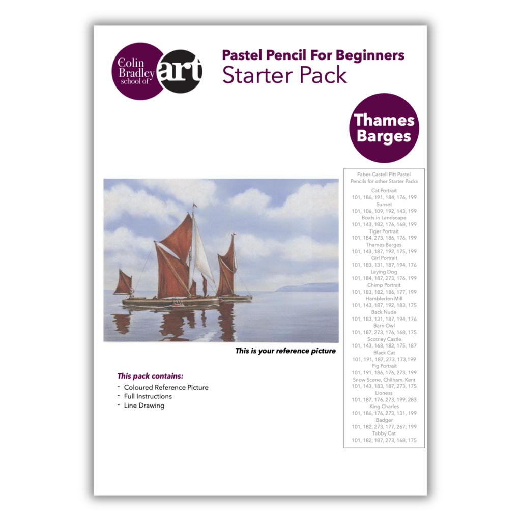 With Colin’s expert tuition and easy-to-follow methods, this Starter Pack is ideal for beginners and improvers. Learn pastel pencil techniques while enjoying the process of completing your own Thames Barges Landscape artwork.